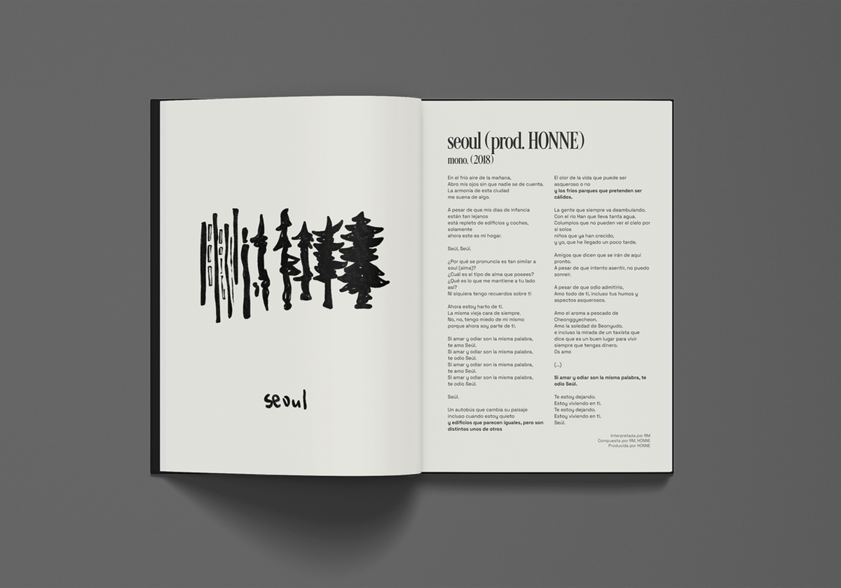 Editorial + illustrationCompilation book of the song lyrics by the South Korean artist RM. Collector's edition.It consists of the lyrics translated from Korean into Spanish, accompanied by an illustration that interprets each song.*Software: Adobe Indesign, Procreate
