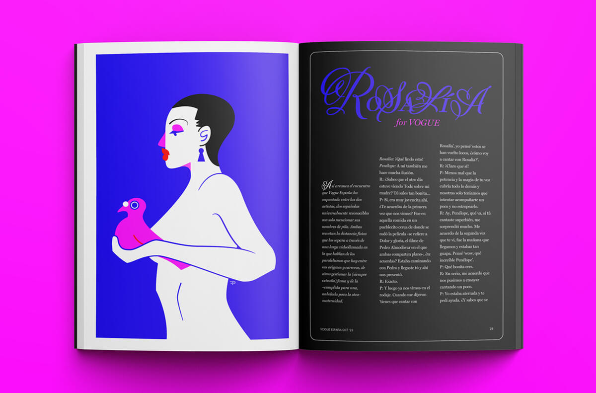 Editorial + illustrationEditorial illustration and layout design for spanish singer Rosalía's October 2024 VOGUE Spain article.Inspired by the article's photoshoot.*Software: Adobe Indesign, Procreate